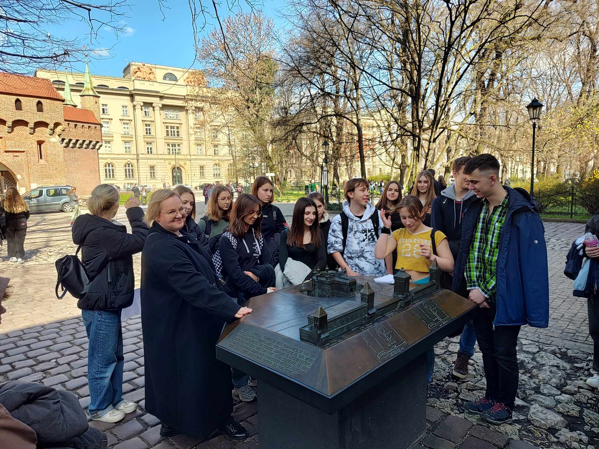 W "Czternastce" odbyła się niezwykła lekcja, a właściwie lekcje - języka polskiego i historii, której inicjatorami byli nauczyciele tych przedmiotów - Pani Alicja Ryś oraz Pan Grzegorz Dadał. Dlaczego niezwykła? Zazwyczaj w sali lekcyjnej podawane są najważniejsze informacje na określony temat. Tym razem było inaczej, gdyż klasa 1a doświadczyła, zobaczyła, a nawet dotknęła najważniejszych zabytków sztuki i architektury Krakowa, pochodzących z epoki średniowiecza. Młodzież przygotowała informacje o wybranych obiektach - o Barbakanie, Bramie Floriańskiej, Kościele Mariackim, Kościele św. Wojciecha oraz Kościele św. Andrzeja, a także wzięła udział w poszukiwaniach legendarnego noża ukrytego w Sukiennicach. Z pewnością to wyjście zapadnie na długo w pamięci klasy 1a
